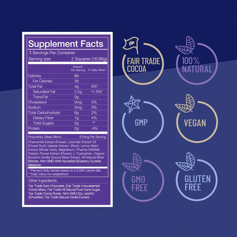 Get ready to snooze like a champ with our Functional Dark Chocolate, crafted to tackle sleep struggles with a dreamy twist! Packed with clinically researched ingredients, this delectable dark chocolate is infused with a blend of vitamins, herbs, and minerals to help you drift off to dreamland. Each bite is a rich, velvety escape into relaxation—because who said bedtime can’t be deliciously fun?