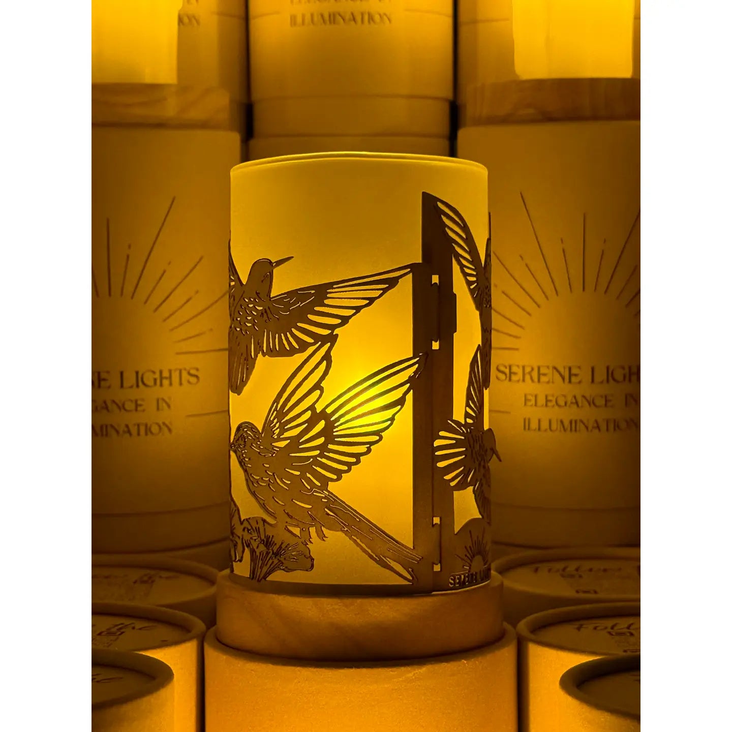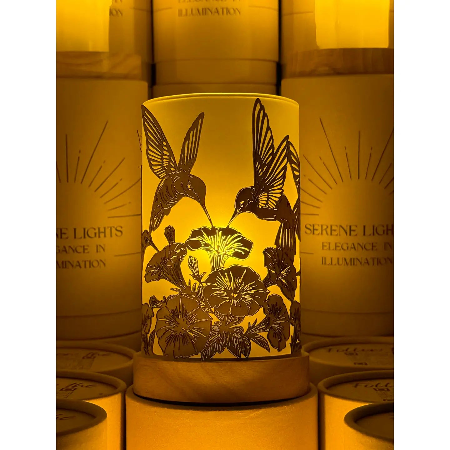 Bring the delicate beauty of nature indoors with our Hummingbirds & Petunias design. This enchanting piece captures the graceful dance of hummingbirds flitting around blooming petunias, etched with intricate detail onto our signature wood veneer. Perfect for nature lovers, this design adds a touch of elegance and serenity to any space, creating a warm, inviting glow that feels truly magical. Your purchase will include: a wooden base made from oak a glass cylinder a tea light a swappable motif A rechargeable candle is also available for purchase. 20 hours per charge automatic 24 hour timers with remote Motifs and bases can be purchased separately.